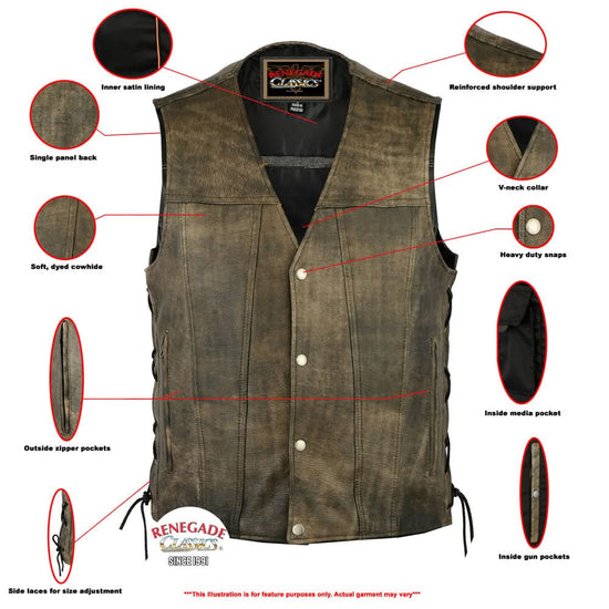 Order your men's brown side lace concealed carry biker vest today from Renegade Classics and receive free shipping on qualifying orders and a 30-day money-back guarantee. We offer free lifetime warranties on all orders. Shop today to find the next addition to your gear collection!